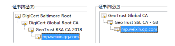 微信公眾平臺的服務器證書支持多域名,即API域名(api.weixin.qq.com)與API容災域名(api2.weixin.qq.com)使用同一張證書,正常情況下請使用api.weixin.qq.com域名,新證書與舊證書的證書鏈區(qū)別如下:(左邊新,右邊舊)。