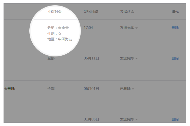 點擊“群發(fā)功能”-“已發(fā)送”可查看已群發(fā)消息,新增該消息對應(yīng)的發(fā)送對象的分組、性別和地區(qū)信息。
