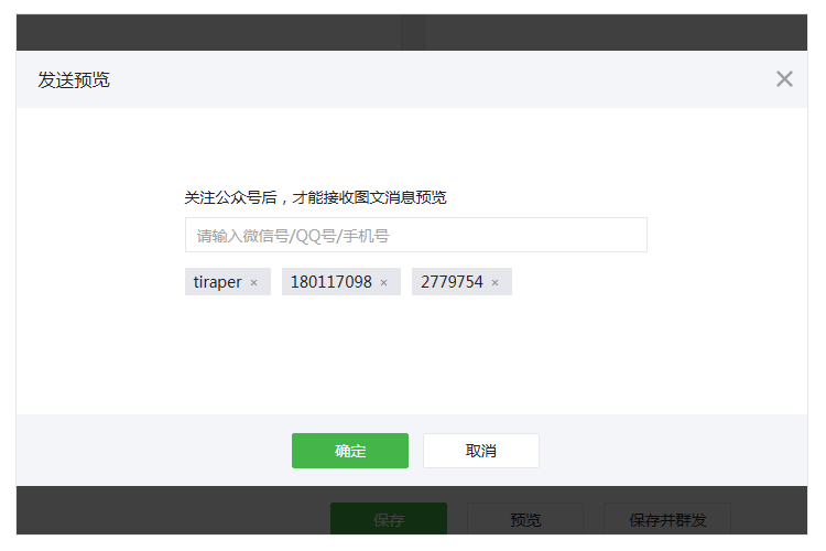 編輯圖文消息時,點擊“預(yù)覽”按鍵,除可輸入微信號發(fā)給需要預(yù)覽的微信用戶外,新增支持已綁定微信號的手機(jī)號和QQ號。