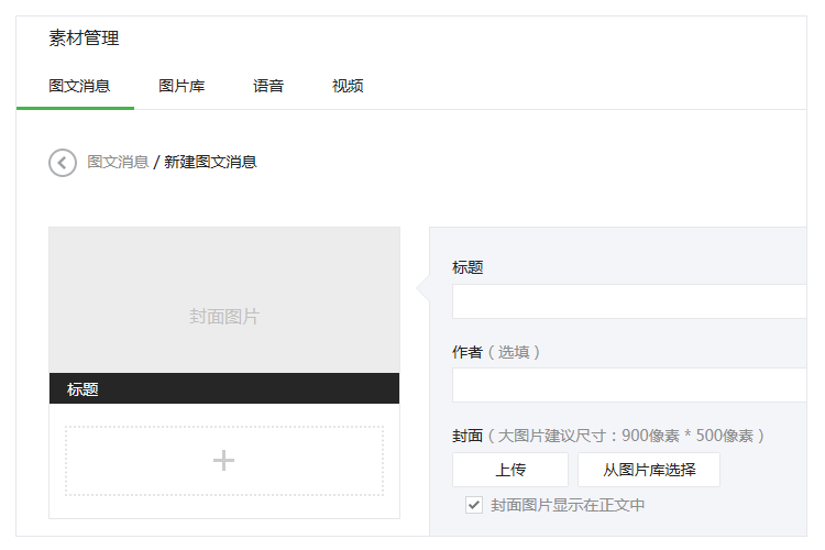 進(jìn)入“素材管理”頁面可直接新建圖文消息,運(yùn)營者無須決定新建單圖文或多圖文。