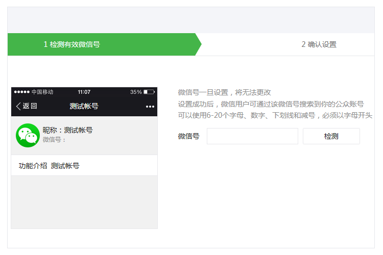 當(dāng)新帳號信息審核通過后,可在“公眾號設(shè)置”進(jìn)行微信號設(shè)置。運(yùn)營者可先檢測預(yù)設(shè)的微信號是否可用,若可用再進(jìn)行下一步操作。此外,設(shè)置微信號時,運(yùn)營者直接可見微信內(nèi)該公眾帳號的微信號展示效果,提升用戶對微信號的理解。