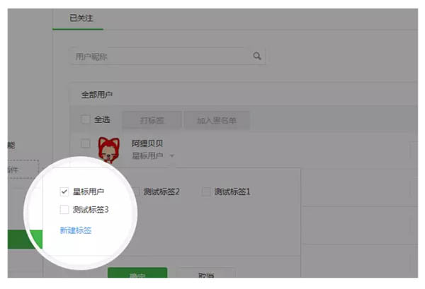 運(yùn)營(yíng)者可登錄公眾平臺(tái)后臺(tái),點(diǎn)擊左側(cè)菜單“用戶管理”后管理已關(guān)注用戶,點(diǎn)擊其中一個(gè)用戶右側(cè)的“標(biāo)簽”小角標(biāo)可彈出復(fù)選框快速為該用戶添加標(biāo)簽,且添加標(biāo)簽復(fù)選框內(nèi)已支持直接新建標(biāo)簽。