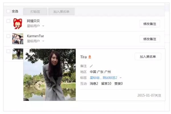 本期新增消息數(shù)、留言數(shù)和贊賞數(shù)等互動(dòng)數(shù)據(jù),且顯示用戶關(guān)注時(shí)間和支持查看用戶頭像大圖,有利于拉近運(yùn)營(yíng)者與用戶的距離。