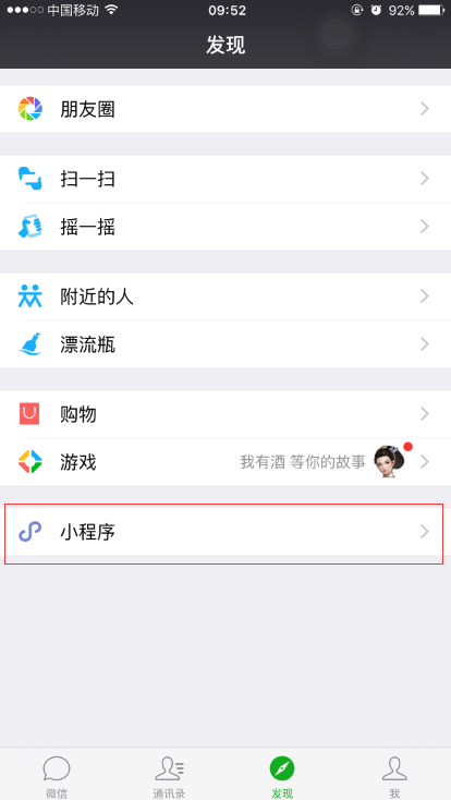 5、退出上面這個(gè)頁面,點(diǎn)開你的微信第三頁面“發(fā)現(xiàn)”,你會(huì)發(fā)現(xiàn),再出現(xiàn)面出現(xiàn)了小程序的入口。