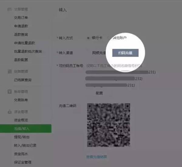 電腦登錄微信支付商戶平臺-交易中心 - 充值轉(zhuǎn)入,選擇轉(zhuǎn)入方式為“掃碼充值”,根據(jù)頁面操作流程進(jìn)行充值;
