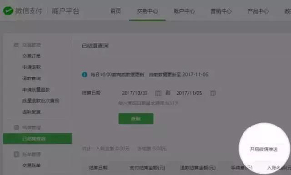 為及時接收到每日交易款結(jié)算提現(xiàn)情況的通知,商戶可以通過電腦登錄微信支付商戶平臺-交易中心-已結(jié)算查詢,點擊“開啟微信推送”,根據(jù)頁面操作流程開通每日交易款結(jié)算情況通知功能;開通后,將于每日早上10點前通過微信支付商戶助手公眾號接收到前一日結(jié)算情況,以及結(jié)算款自動提現(xiàn)進(jìn)展。