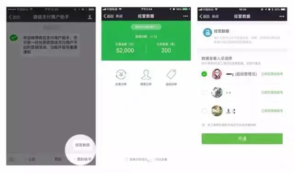 過去,商戶想要查看經(jīng)營數(shù)據(jù),需要在PC端輸入帳號、密碼,登錄后臺查看,無法實時管理?,F(xiàn)在,商戶只需通過微信支付商戶助手公眾號-我的帳號-經(jīng)營數(shù)據(jù),管理員根據(jù)流程指引開通該功能,還可以設(shè)置員工一起使用該功能,真正做到經(jīng)營數(shù)據(jù)管理移動化。