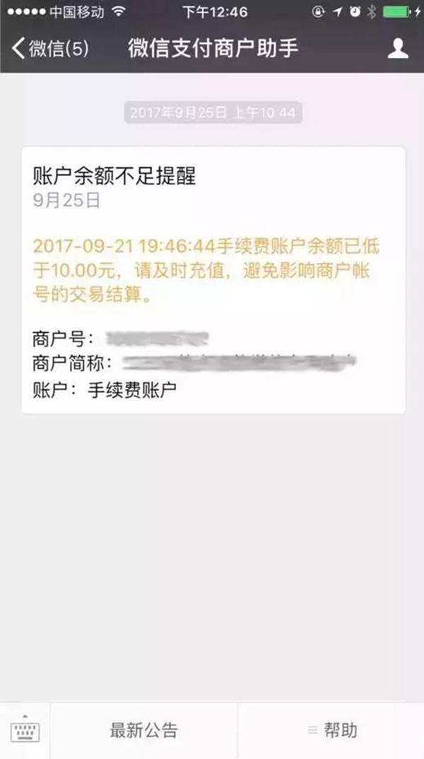 當(dāng)手續(xù)費(fèi)賬戶余額低于設(shè)置金額時,會通過微信支付商戶助手公眾號下發(fā)賬戶余額不足提醒;