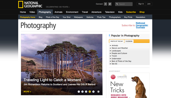 如果一張漂亮的圖片對你的項目有幫助,別僅限于從中汲取靈感,直接使用它。大膽設計,聚焦于這張漂亮圖片。另一方面,如果你沒有合適的圖片,搜羅全世界的照片來尋找靈感。當你感到艱難、設計卡住時,National Geographic、Jill Greenberg和Levon Biss,就是尋求幫助的絕佳地方(而且這些網(wǎng)站圍繞圖片的設計都做得不錯)一張焦點圖一張圖片。