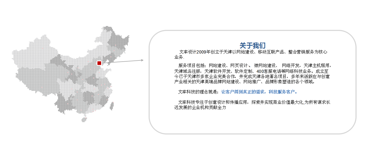 文率科技的服務項目包括:天津網站建設、微網站建設、天津網站設計,網絡開發(fā),天津主機租用,天津域名注冊,天津軟件開發(fā)、軟件定制、400客服電話等網絡科技業(yè)務。成立至今已于天津市多家企業(yè)完美合作,并完成天津各地著名項目,多年來活躍在與創(chuàng)意產業(yè)相關的天津高端品牌網站建設、網站推廣、品牌形象塑造的各個領域。