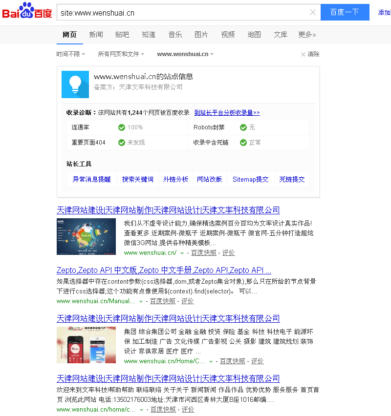 2.百度收錄:在百度里面通過指令site:就可以查詢到。通過收錄,我們可以分析出一系列的問題,如site:m.avishai84.com 見下圖我們可以看到文率科技的首頁在⑴位,如果不在⑴位或者收錄降了很多說明網(wǎng)站被降權(quán)了,這樣我們就可以通過收錄的數(shù)據(jù),對比同等級下的兩個頁面(一個收錄了一個未收錄),找出頁面未收錄的原因,從而改進。