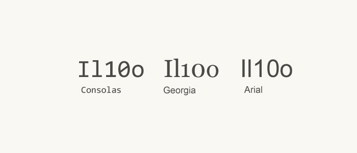 在Arial字體中,i,l 的辨識度很低,而且當(dāng)有連續(xù)的il等較窄文字出現(xiàn)時,文字難以選中。此外Georgia中,字母o,與數(shù)字0 只在大小上略有區(qū)別,基本上分不清,很難做到一目了然。由此可見,等寬字體受字母本身的干擾較小,字母大小固定,密度固定,此類字體,簡單容易辨認,大大提升了閱讀效率。