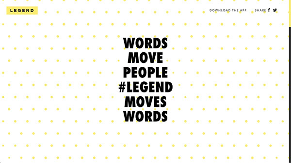 Legend可以幫你將文字轉(zhuǎn)化為GIF圖或者視頻格式,網(wǎng)頁中也加入了大量的動效來展示這款應(yīng)用的實際效果。這種充滿活力的展示方式,同樣是非常值得設(shè)計師學(xué)習(xí)和借鑒。