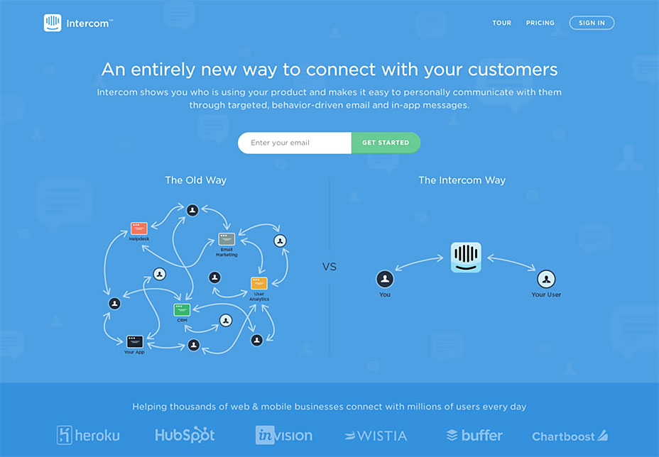 Intercom服務(wù)可幫助用戶提高向客戶發(fā)送電子郵件的效率。其登陸頁采用了相對比較復(fù)雜的理念以便大家理解產(chǎn)品工作原理以及好處所在。這個設(shè)計中我最喜歡的是對比展示舊有工作方式和Intercome的簡便方法。