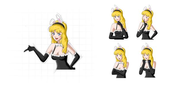 隨后考慮到形象的多場景應(yīng)用問題,又增加了兔女郎俏皮、興奮、失望等表情動作。并計劃在后期的設(shè)計中增加兔女郎的人物個數(shù),塑造3個不同性格不同風(fēng)格的兔女郎形象來滿足不同用戶的喜好。