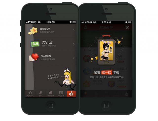 在卡通人物設(shè)計完成后,加入到了APP的推薦功能頁面設(shè)計和搖一搖幸運(yùn)號頁面設(shè)計中,使頁面增色不少。我們希望通過這一系列的卡通形象包裝,讓易迅彩票APP更有趣的同時更具情感,從而間接的提升了產(chǎn)品的用戶粘性。