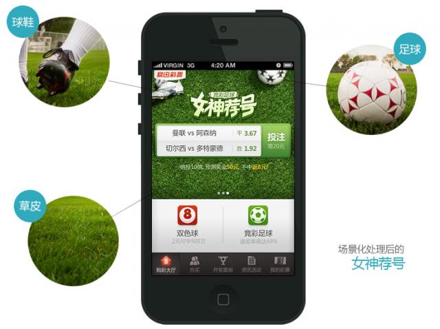 易迅彩票作為趣味化導(dǎo)向的產(chǎn)品,在保證功能簡單好用的前提下,適當(dāng)?shù)募尤雸鼍盎O(shè)計,能夠很好地提升頁面的娛樂性。因為相比于傳統(tǒng)的單純功能性購彩頁面,通過場景化設(shè)計后的頁面更具視覺感染力和使用帶入感。因此我們在競彩足球彩種的女神推薦欄目和購彩頁面嘗試運(yùn)用了場景化設(shè)計的手法。
