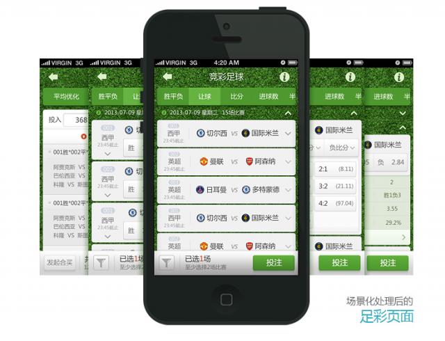 競彩足球的購彩頁面則由于展示信息量大和操作區(qū)域相對固定的原因,只能延續(xù)足球的草地場景,舍棄了其他視覺元素。盡管如此加入了足球場背景,強(qiáng)化了足球氛圍的頁面,更容易引起足球彩民的共鳴。