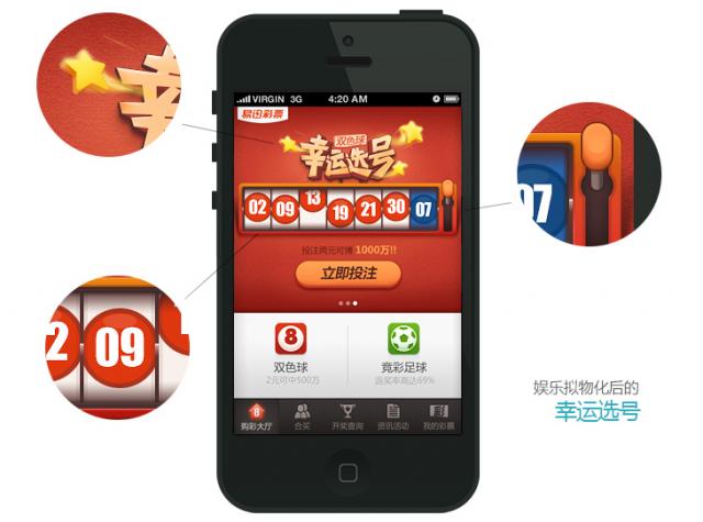 賭場中有一種拉霸抽獎的游戲機(jī),玩家通過拉動操作桿不斷刷新屏幕上的圖案來進(jìn)行抽獎。它操作簡單,玩法有趣很容易使人沉迷其中。這種拉霸抽獎的形式,非常富有隨機(jī)性,又含有博彩的寓意,操作展示形式也與隨機(jī)選號有很高契合度。因此我們將幸運(yùn)選號的功能布局進(jìn)行了重新設(shè)計,力求模擬成拉霸游戲機(jī)的形式來展現(xiàn)。用戶同樣只需要拉動操作桿,即可獲得一注雙色球號碼進(jìn)行投注,整個操作流程簡單有趣。