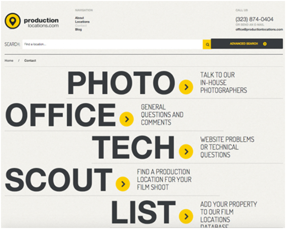 看起來好看的網(wǎng)頁頁面設計并不能說是一個成功的網(wǎng)站設計,最主要的是能夠迎合用戶,能夠有良好的用戶體驗,是屬于用戶友好型的。如:Productiong Location的聯(lián)系我們頁面采用了大膽而視覺化的頁面設計,但是和其他的同類頁面不同的是,它簡化了溝通流程,把用戶可能會關注的內容和需要溝通的具體部分都劃分了一下,讓不同需求的用戶直接被引導到特定的頁面和部分,從而達成簡化和分流的目的。