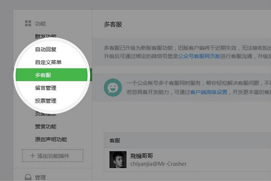 多客服功能是微信公眾平臺(tái)較早之前推出的功能,由于推出的時(shí)間較久,維護(hù)和迭代的成本較高,我們推出了新版的客服功能。舊版多客服將于近期正式下線,請(qǐng)公眾號(hào)運(yùn)營者盡快升級(jí)。升級(jí)到新版網(wǎng)頁客服功能后,用戶和公眾號(hào)互動(dòng)的消息將推送到新版網(wǎng)頁客服系統(tǒng),舊版多客服客戶端將失效(無法再收到消息),且無法返回到舊版。具體升級(jí)方法,請(qǐng)查看詳情(http://kf.qq.com/faq/120911VrYVrA160126Nvi6NN.html)。