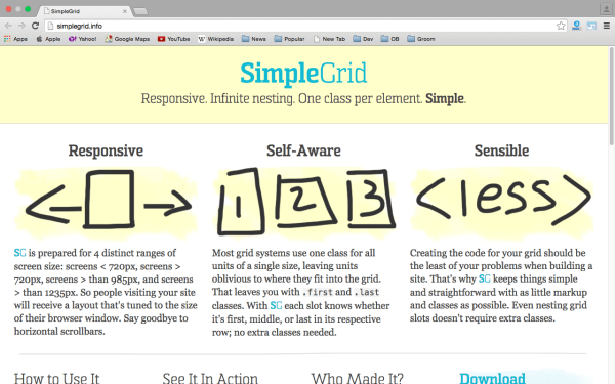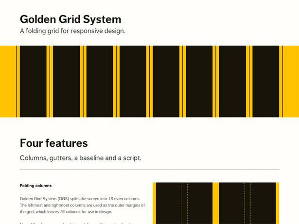 Joni Korpi的開發(fā)和Less Framework是同一人,近期已經發(fā)布了這個可靠的Grid系統(tǒng)的新版本。因為其易于適應從16個到8個到4個欄,被視為“折疊式”。Golden Grid System還具有另一個特色,可以在測試時用一個小型瀏覽器覆蓋您所制作的頁面上的Grid。