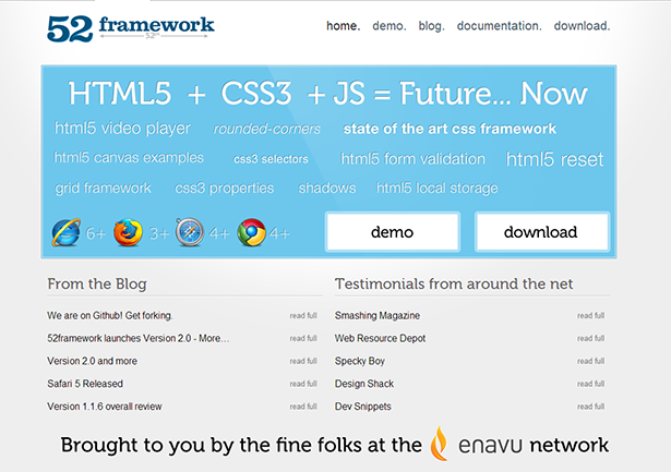 52 Framework主要用于優(yōu)化HTML5和CSS3的跨瀏覽器兼容性的框架,可在所有主流瀏覽器上運行。