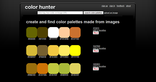 ColorHunter在線配色篩選工具是一個可以按照圖片來自動生成相應的不同調(diào)色板,也就是配色方案。如果你想尋找某種風格的配色方案,可以在網(wǎng)站上方的搜索區(qū)域進行相應的搜索。除了根據(jù)圖片來尋找配色外,你還可以輸入tag名稱、16進制顏色值或Flickr網(wǎng)站中的照片(圖片)網(wǎng)址進行搜索。